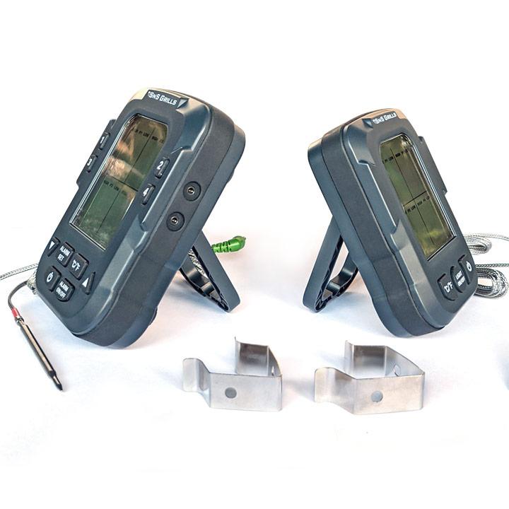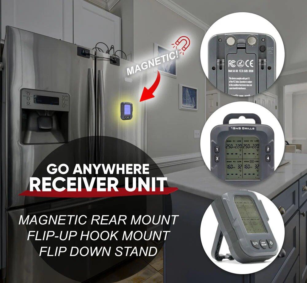 Цифровий термометр від SnS для дистанційного зчитування температури м'яса та інших гриль-делікатесів. Два модулі – передавач і приймач, вражаюча робоча дистанція до 150 м, контроль до 4 щупів, яскраві екрани та зручні кнопки, калібрування і тонке налаштування для ваших страв і до того ж ліхтарик для роботи вночі.