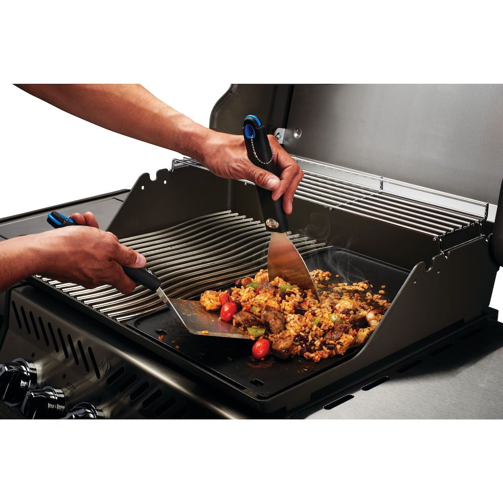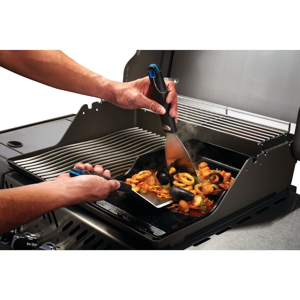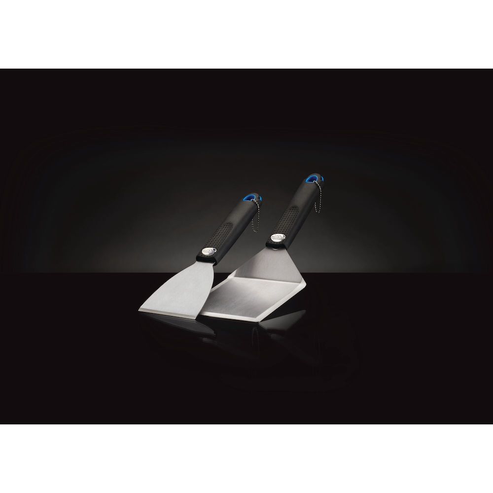 Набір для приготування на планчі складається із двох практичних інструментів. І любителі, і професіонали вважають за краще купити аксесуари для гриля саме цієї моделі. Велика лопатка дає можливість комфортно перевертати продукти в момент термічної обробки, а за допомогою скребка ви легко зчистите залишки їжі та жиру з металевої поверхні. Ці атрибути мають такі переваги: