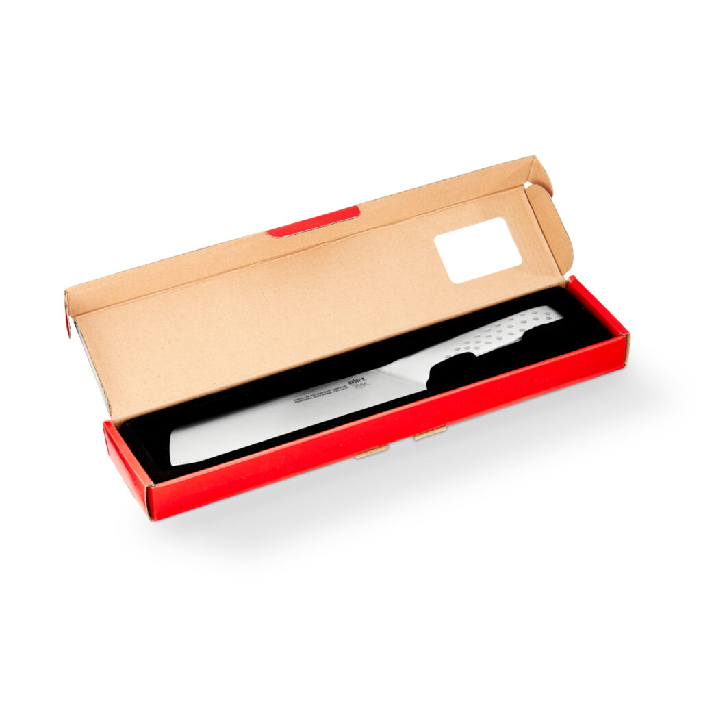Принесіть радість до столу у вигляді фірмового салату або азіатської сковороди-гриль з великою кількістю овочів. Ви зможете швидко й легко нарізати овочі за допомогою гострого розкішного кухонного ножа від Weber. Довгостроковість служби забезпечує високоякісна нержавіюча сталь. Завдяки елегантному дизайну фірмовий ніж підходить для будь-якої кухні. Загальна довжина: 23 см, довжина леза: 14 см, довжина ручки 9 см.