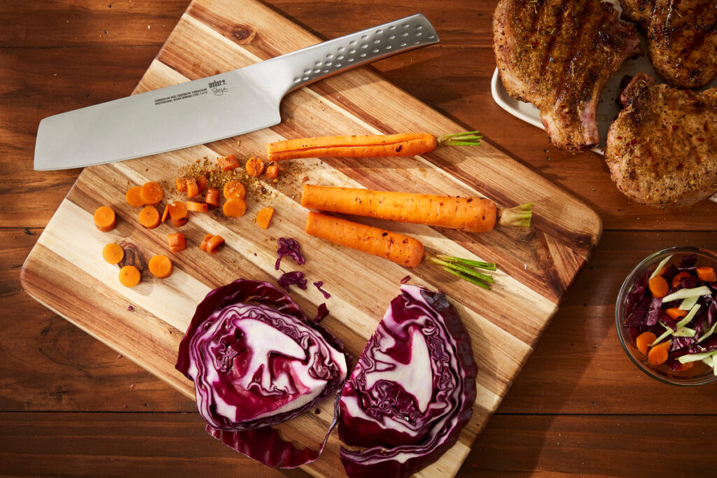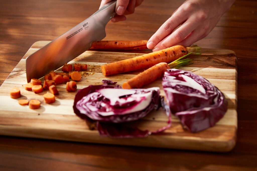 Принесіть радість до столу у вигляді фірмового салату або азіатської сковороди-гриль з великою кількістю овочів. Ви зможете швидко й легко нарізати овочі за допомогою гострого розкішного кухонного ножа від Weber. Довгостроковість служби забезпечує високоякісна нержавіюча сталь. Завдяки елегантному дизайну фірмовий ніж підходить для будь-якої кухні.