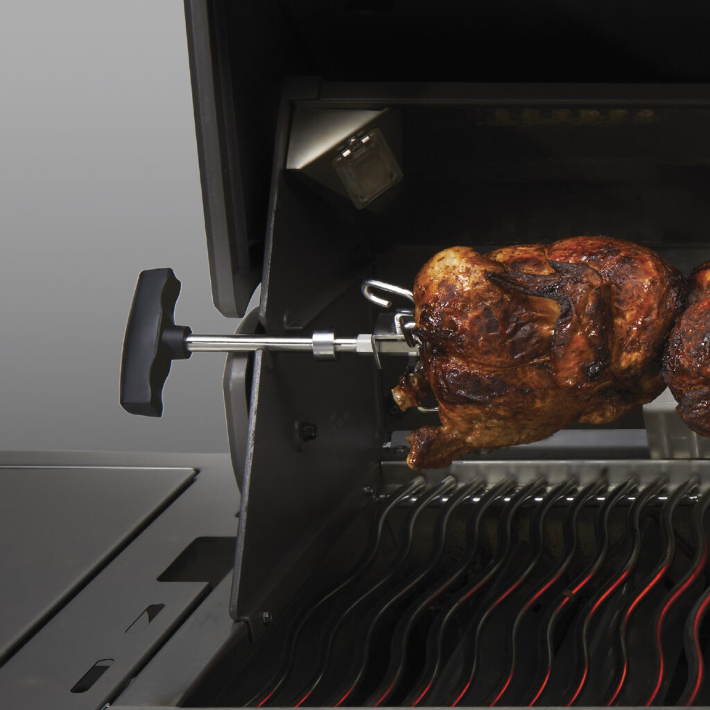 Прекрасний результат готування з рожном від Napoleon. При смаженні на рожні зазвичай використовується мінімальна кількість олії. Весь зайвий жир стікає вниз, у результаті ви отримуєте соковите, рум’яне та не дуже жирне блюдо.