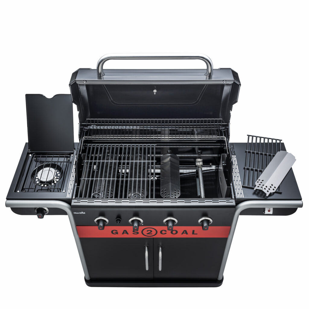 Менее чем за 60 секунд его можно превратить из газового гриля в угольный без использования каких-либо инструментов. Уголь просто засыпается в поддон для угля и разжигается газовыми горелками из нержавеющей стали, разжигатель угля не требуется.