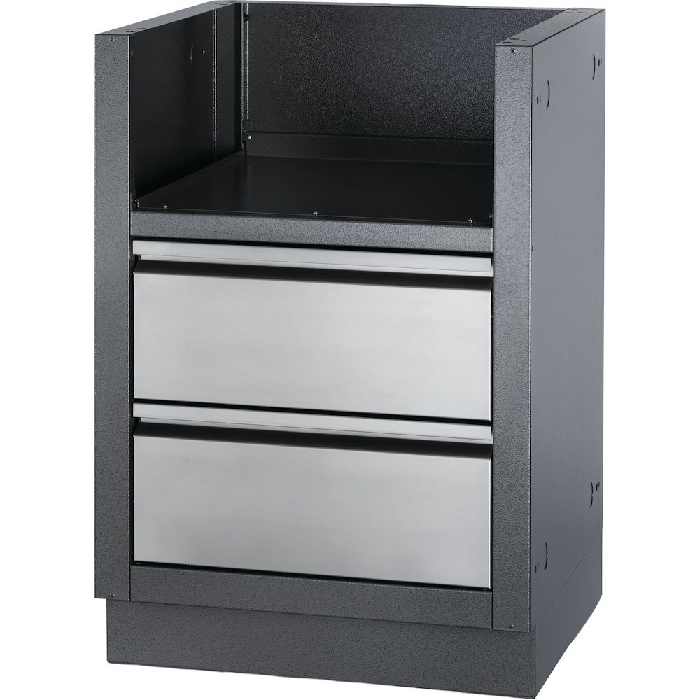 Спеціально створена тумба для 18-дюймових конфорок серії 700, що вбудовуються, ідеально поєднується з літньою кухнею Napoleon OASIS™. Ця тумба з гальванічним покриттям з фарбованим корпусом карбонового кольору порошковим покриттям відрізняється підвищеною довговічністю завдяки двошаровій системі оздоблення. Два ящики з нержавіючої сталі встановлені на гладких ковзаючих напрямних для зберігання аксесуарів під грилем. Установка дуже проста завдяки отворам для газу та електрики. Ніжки, що вирівнюються, забезпечують збалансовану поверхню, навіть якщо ваше патіо не ідеально рівне.