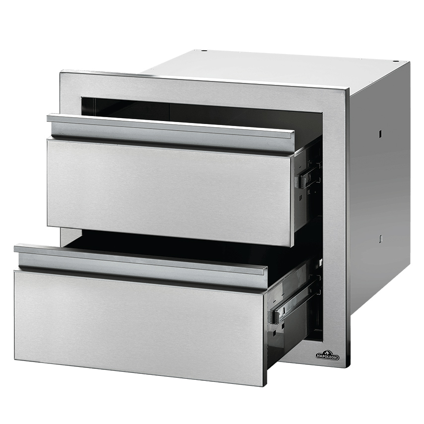 Цей стильний елемент складається з двох висувних ящиків, які виготовлені з нержавіючої сталі та оснащені доводчиками для м’якого закриття. Зручні ручки ящиків виготовлені з анодованого алюмінію, що гарантує їхню довговічність та стійкість до подряпин. Ідеально підходить для зберігання аксесуарів для барбекю, спецій та іншого приладдя на Вашій літній кухні.