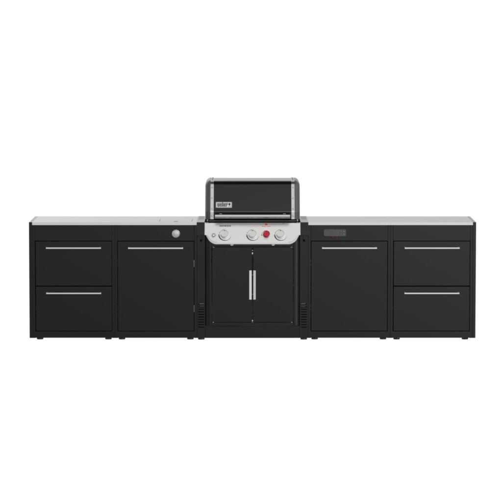 Модульна вулична кухня від Weber — це ідеальне рішення для організації повноцінного кулінарного простору поруч із грилем. Комплект складається з чотирьох функціональних модулів, які поєднують зберігання, робочі поверхні та інтеграцію бокового пальника. Гриль Genesis не входить у комплект.