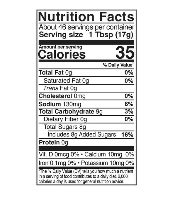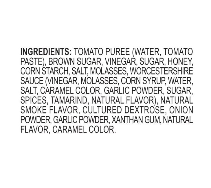 Томатне пюре (вода, томатна паста), коричневий цукор, оцет, цукор, мед, кукурудзяний крохмаль, сіль, меляса, вустерширський соус (оцет, меляса, кукурудзяний сироп, вода, сіль, карамельний барвник, часниковий порошок, цукор, спеції, тамаринд, натуральний ароматизатор), натуральний димний ароматизатор, культивована декстроза, цибульний порошок, часниковий порошок, ксантанова камедь, натуральний ароматизатор, карамельний барвник.