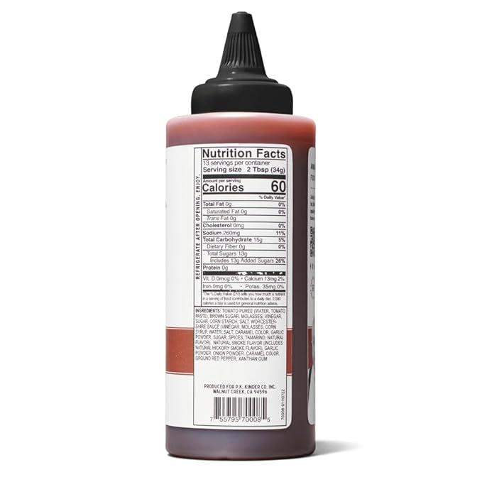 Склад: Томатна паста, коричневий цукор, оцет, патока, вода, сіль, часник, спеції, натуральний ароматизатор гікорі, цибульний порошок, карамельний колер.